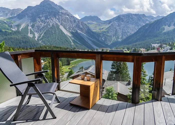 湖の景色を見渡す広々としたベッドルーム1室のSeeblick アローザアパートは、アローザのインネラローザ・チュッゲンから2.6kmの距離です。 この70m²のアパートには、山の景色を望むテラスが備わります。